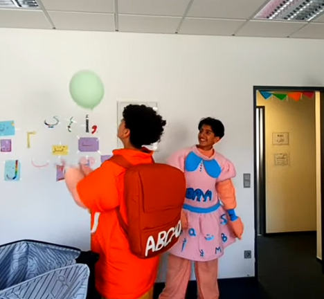 Die Geschichte von Ahmed und Mustafa mit Abgad und Dana begann bereits in ihrer Kindheit, als sie die beiden Figuren im Alter von acht Jahren kennenlernten und seitdem schöne Erinnerungen und Fotos mit Abgad bewahrten. Im Jahr 2025 entschieden sich Ahmed und Mustafa, den nächsten Schritt zu gehen – vom Beobachten zum aktiven Gestalten – und selbst zu Helden des Friedens und der kulturellen Vielfalt – Abgad und Dana zu werden.